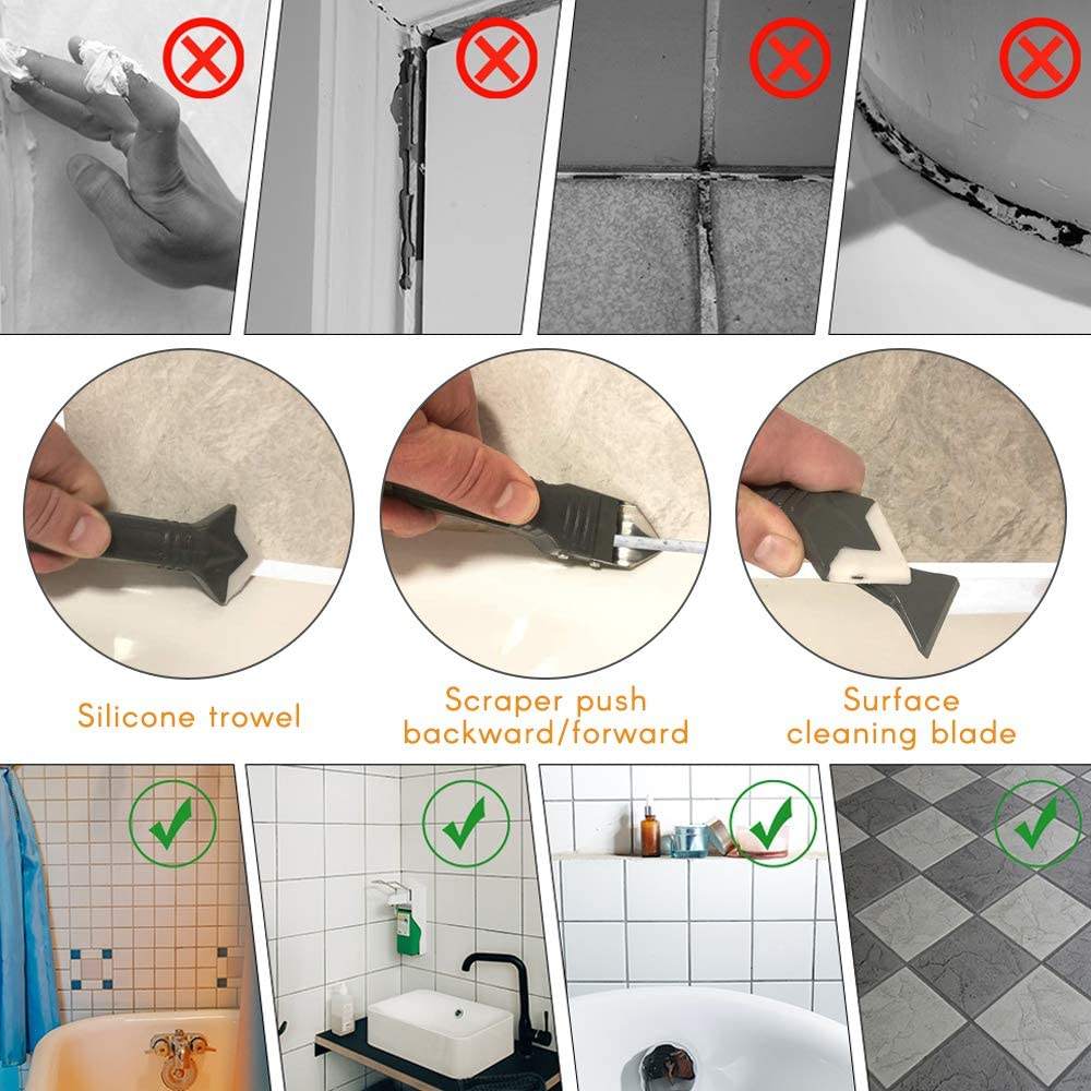 GREATCAULK silicone caulking tools is stainless steel scraper.Stainless steel scraper to remove the stubborn old glue, Silicone Trowel to remove surface bumps and dents, white silicone pads for smoothing the sealing line and corner.